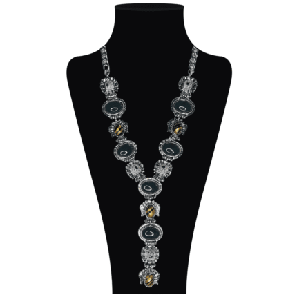Collar largo plateado estilo boho, de aleación de metales y resinas de colores otoñales.