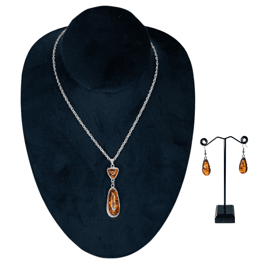 Armónico juego de aretes y cadena plateada, con dijes de resina color ámbar.