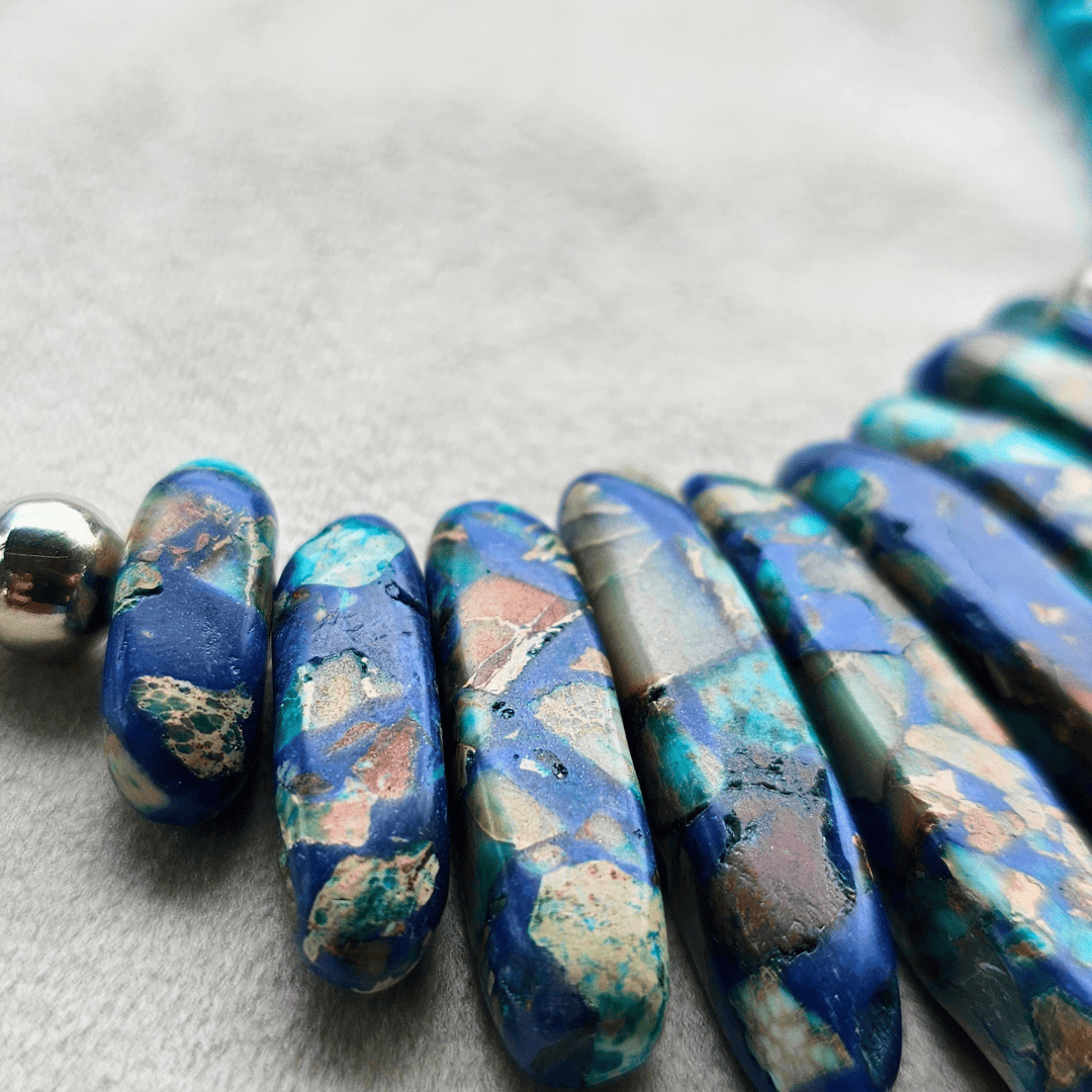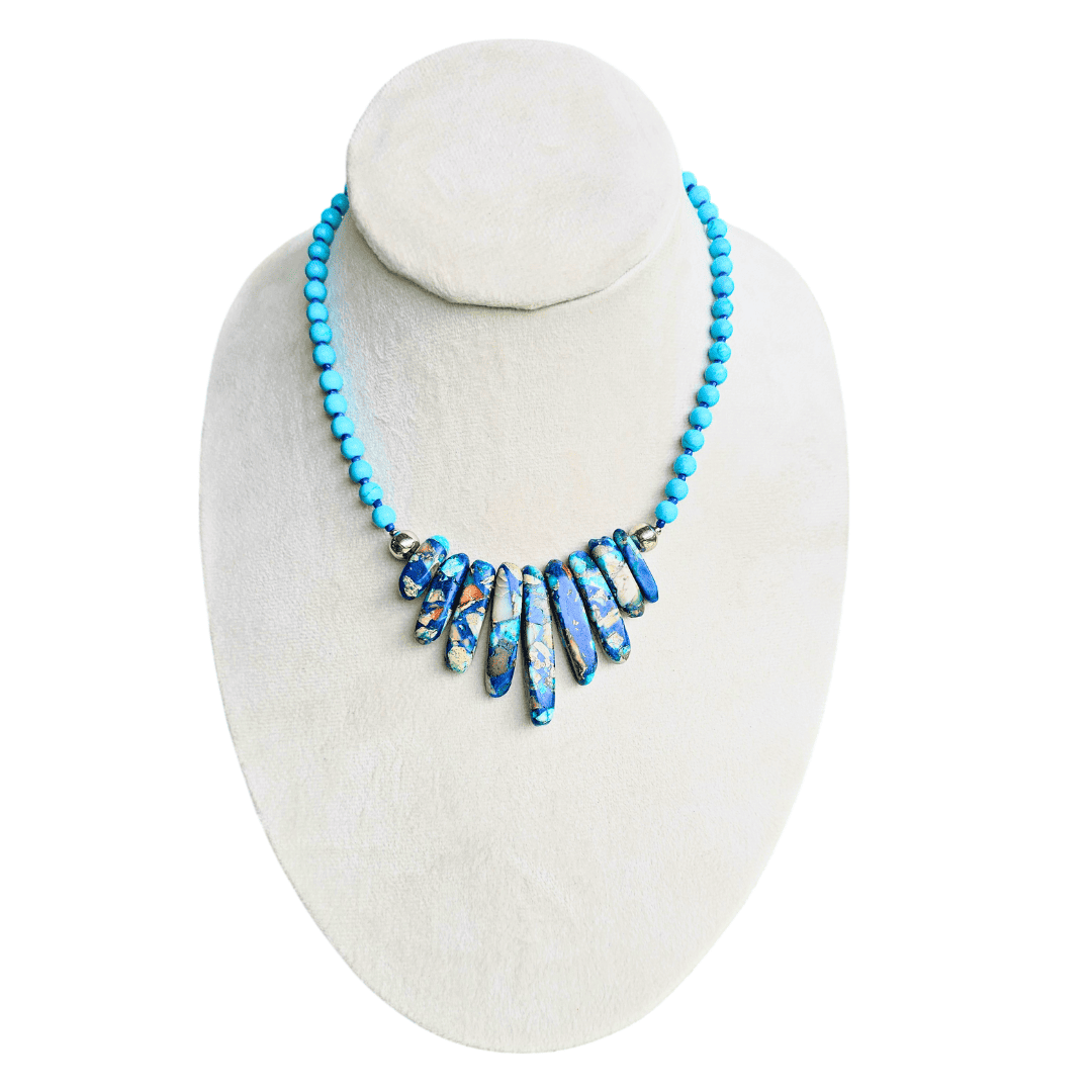 Un atrevido y vibrante collar diseñado para hacer una declaración de estilo impactante. Presenta una impactante hilera de palos formados por un exquisito mosaico de azul profundo Lapislázuli y brillante Turquesa. Materiales: Cuenta con un baño de plata de alta calidad y un elegante terminado en cuentas esféricas de turquesa. Diseño: Su composición geométrica y riqueza de color lo convierten en una pieza de diseño único. Ideal para: Usar con escotes sencillos o sobre una prenda de mezclilla, añadiendo un toque bohemio y sofisticado a tu look.