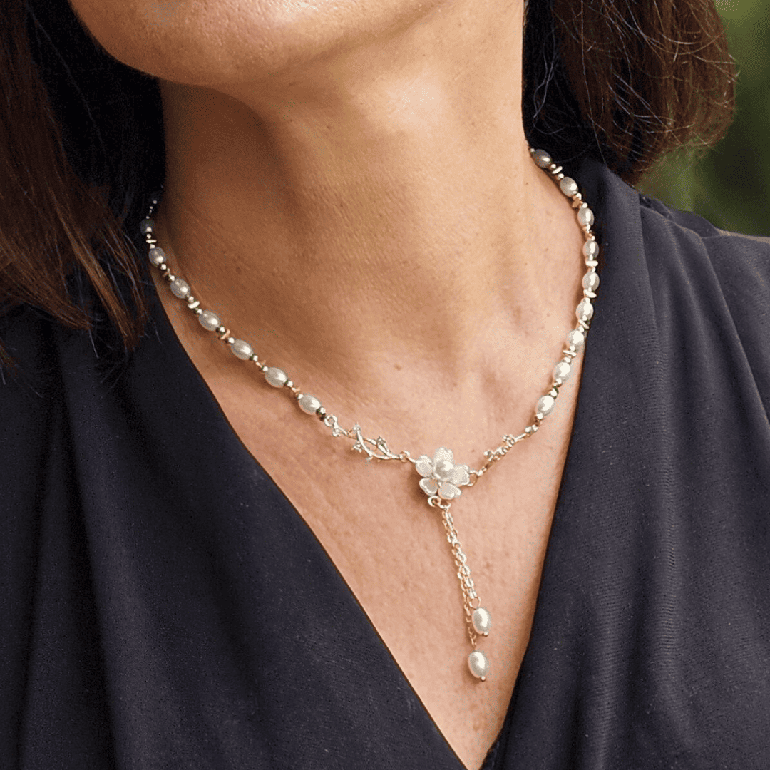 Delicada gargantilla de cobre con baño dorado con sutil diseño de flor en el centro y perla acrílica.