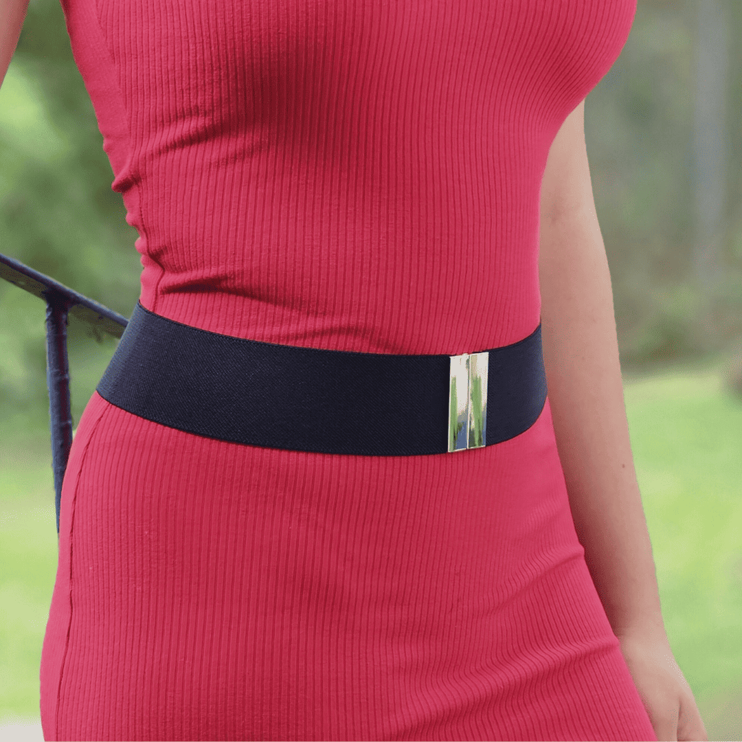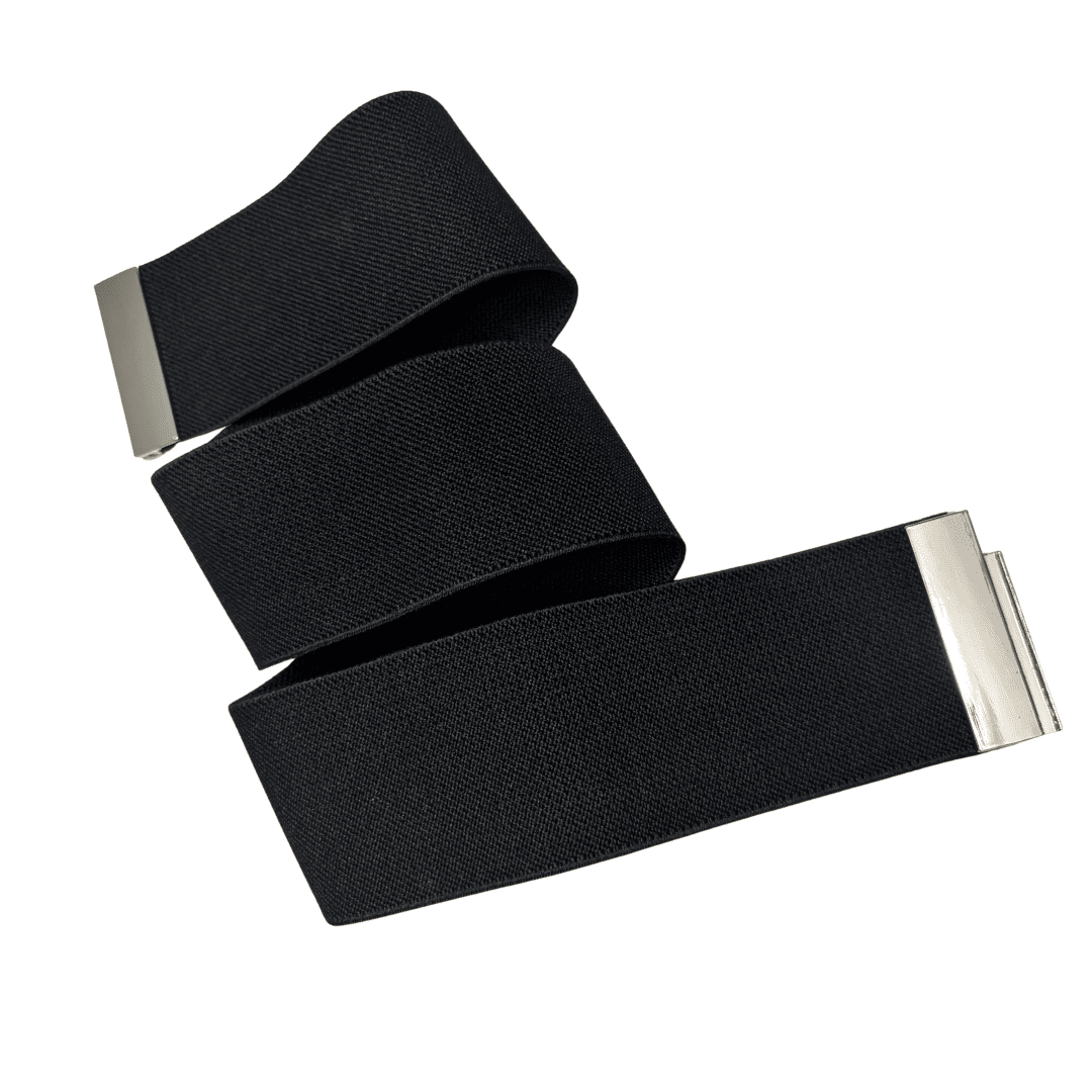Delicado cinturón negro de banda elástica de 5cm de ancho, con hebilla minimalista plateada.