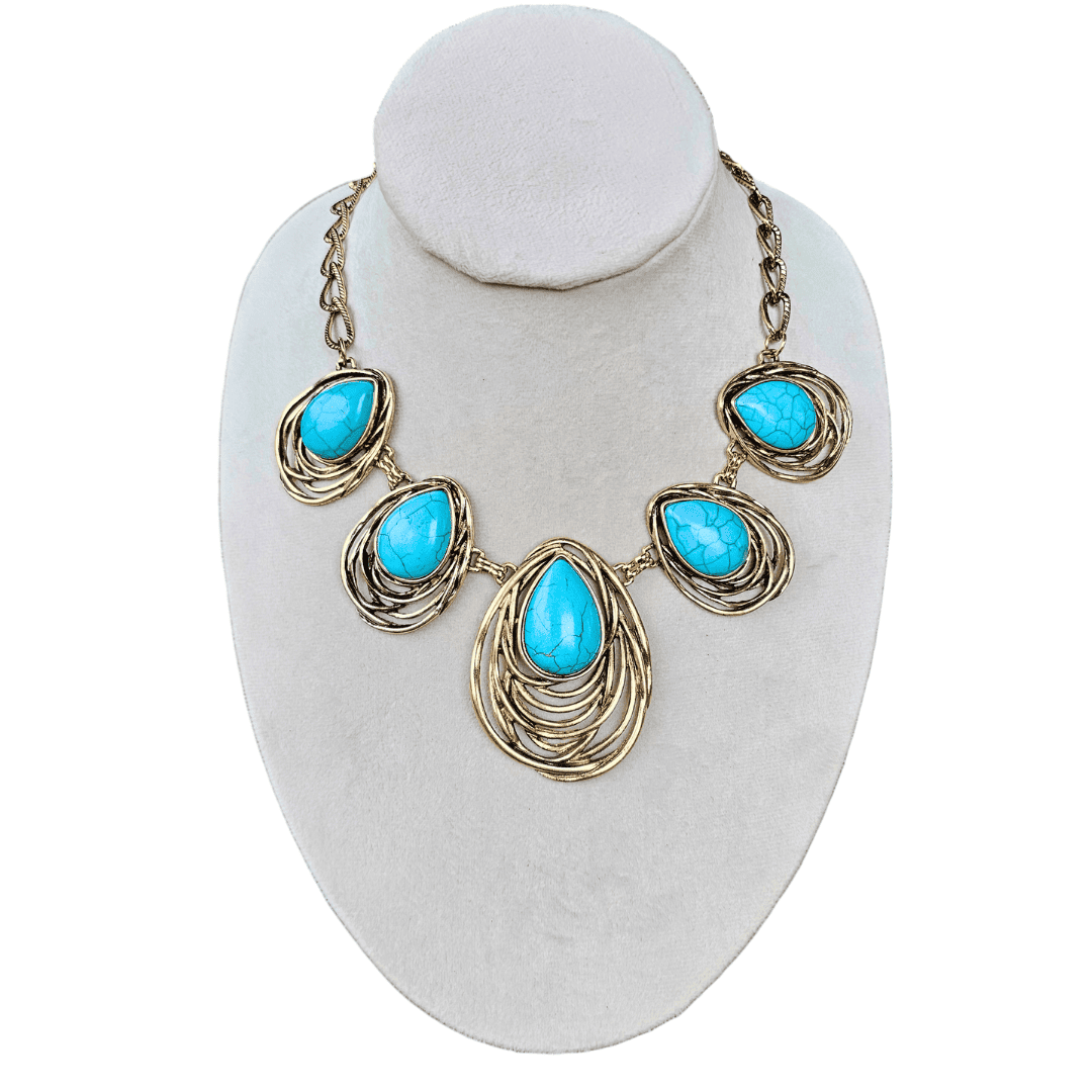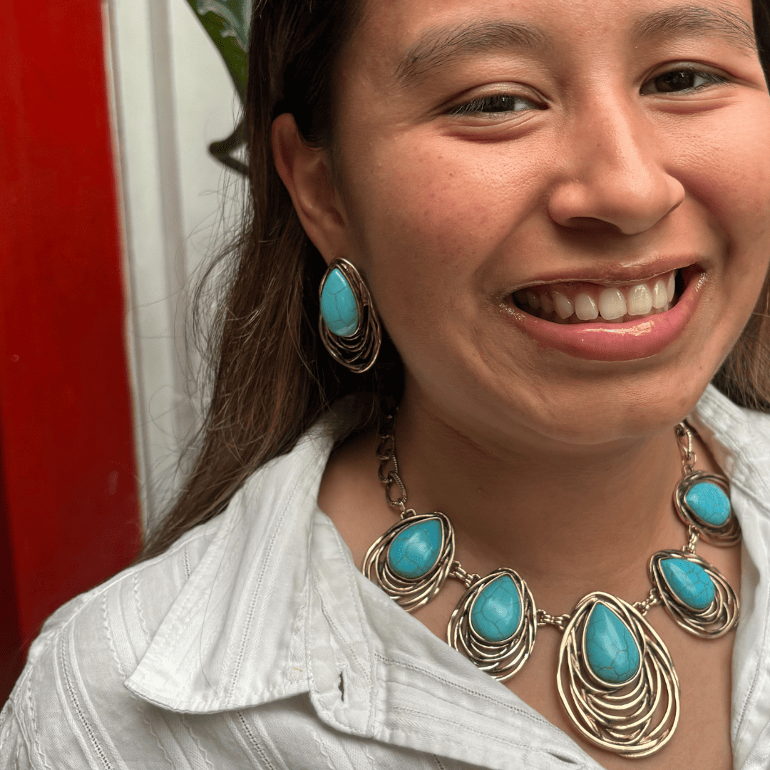 Deslumbrante juego de collar y aretes de aleación de metales color bronce y turquesa.