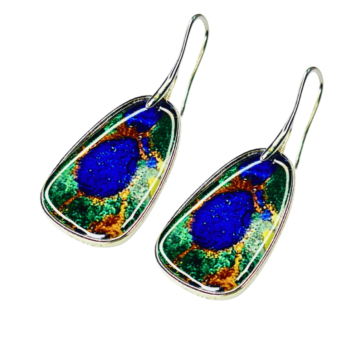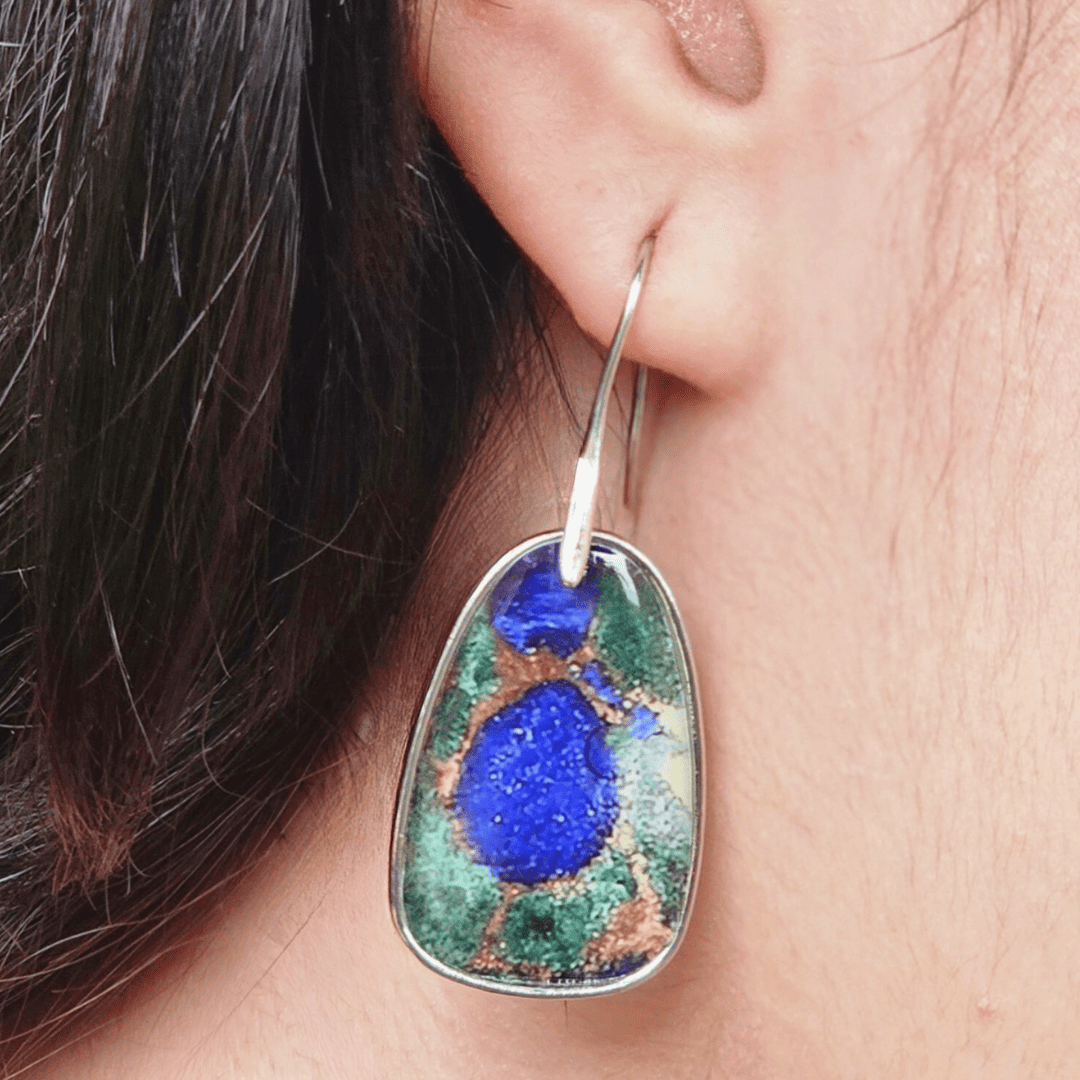 Encantadores aretes de tamaño mediano, diseñados para evocar la tranquilidad de aguas cristalinas. Su forma está rellena con una vibrante resina en una mezcla fascinante de tonos verde esmeralda y azul turquesa. Materiales: Confeccionados en una aleación de metales con un acabado plateado pulido que realza la intensidad de los colores. Estilo: Son el accesorio perfecto para inyectar una sensación de frescura y color a tu rostro. Ideal para: Complementar atuendos veraniegos o para quienes adoran los tonos inspirados en el mar y la naturaleza.
