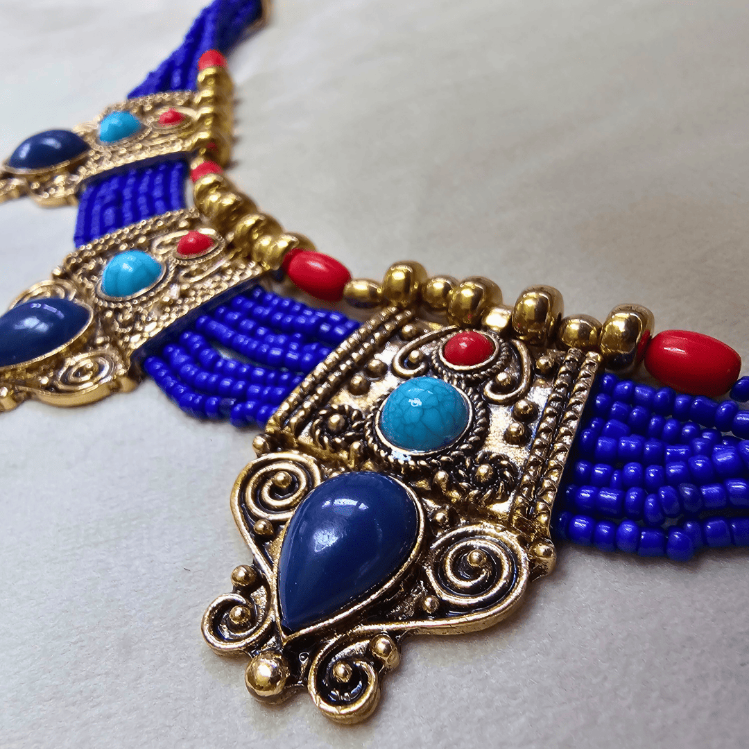 Un hermoso y cautivador collar tipo egipcio, diseñado para evocar la majestuosidad de la antigüedad sin sacrificar la comodidad. Ligereza y Brillo: La pieza central es sorprendentemente ligera, lo que permite un uso prolongado, pero su brillo y diseño te harán resplandecer dondequiera que vayas. Estilo: Sus detalles intrincados y su forma escultural son una declaración de poder y elegancia. Ideal para: Una mujer que desea un accesorio statement para eventos especiales o para añadir un toque exótico y dramático a su vestuario.