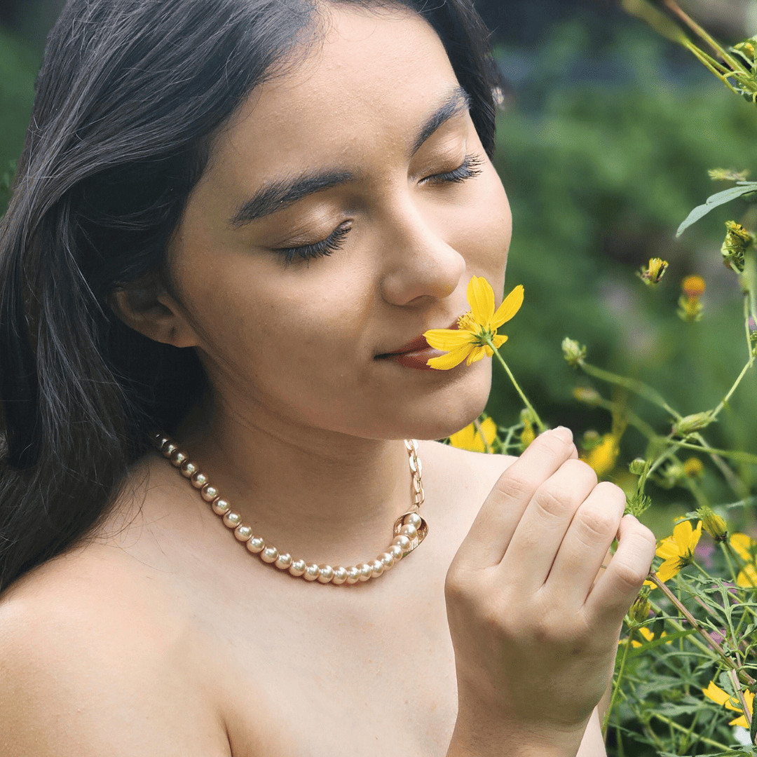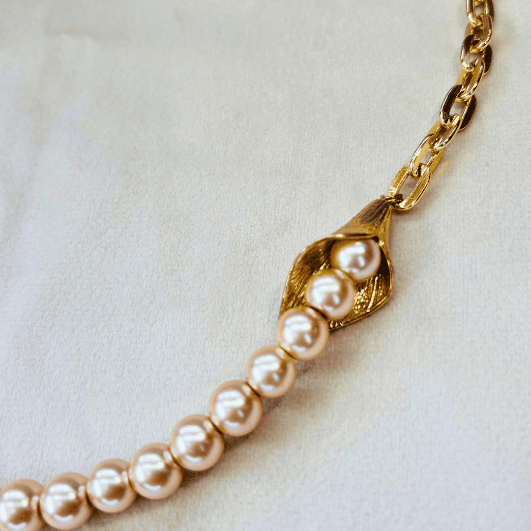 Exquisito collar asimétrico de perlas de cristal color durazno. Cadena dorada, baño de oro 18k.