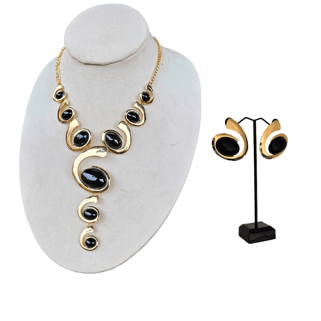 Fabuloso y elegante juego de collar y aretes, diseñado para brillar con un contraste de lujo y misterio. Las piezas capturan la luz con un brillo inigualable. Materiales: Confeccionados en una aleación de metales con un radiante acabado dorado. Detalle Estelar: Están suntuosamente engastados con deslumbrantes cristales negros, que añaden un toque de sofisticación dramática y profundidad. Ideal para: Eventos formales, cenas o fiestas. Es el conjunto perfecto para enmarcar el cuello y el rostro con un lujo audaz y cautivador.
