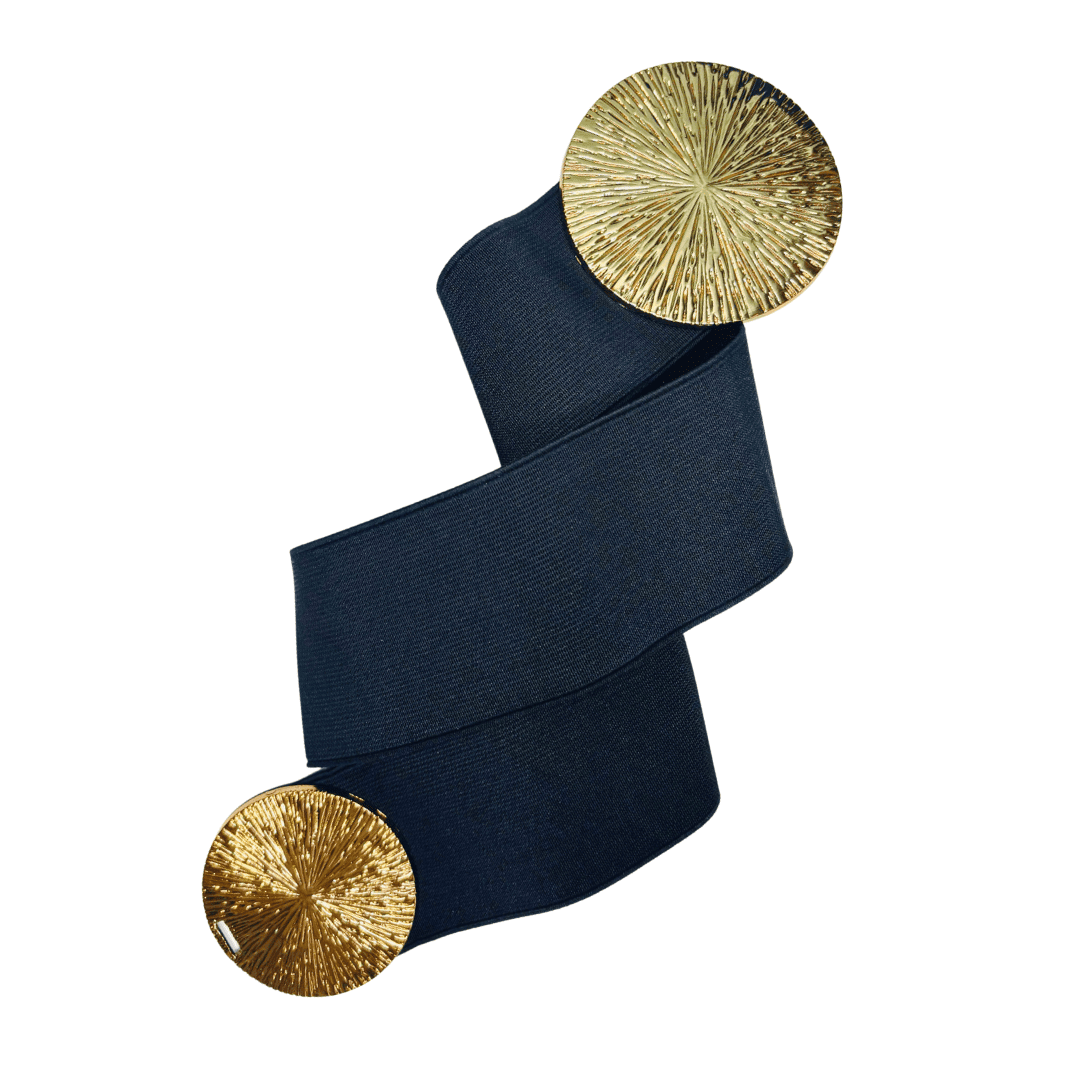 Halagador cinturón negro de banda elástica de 6cm de ancho, hebilla redonda dorada.
