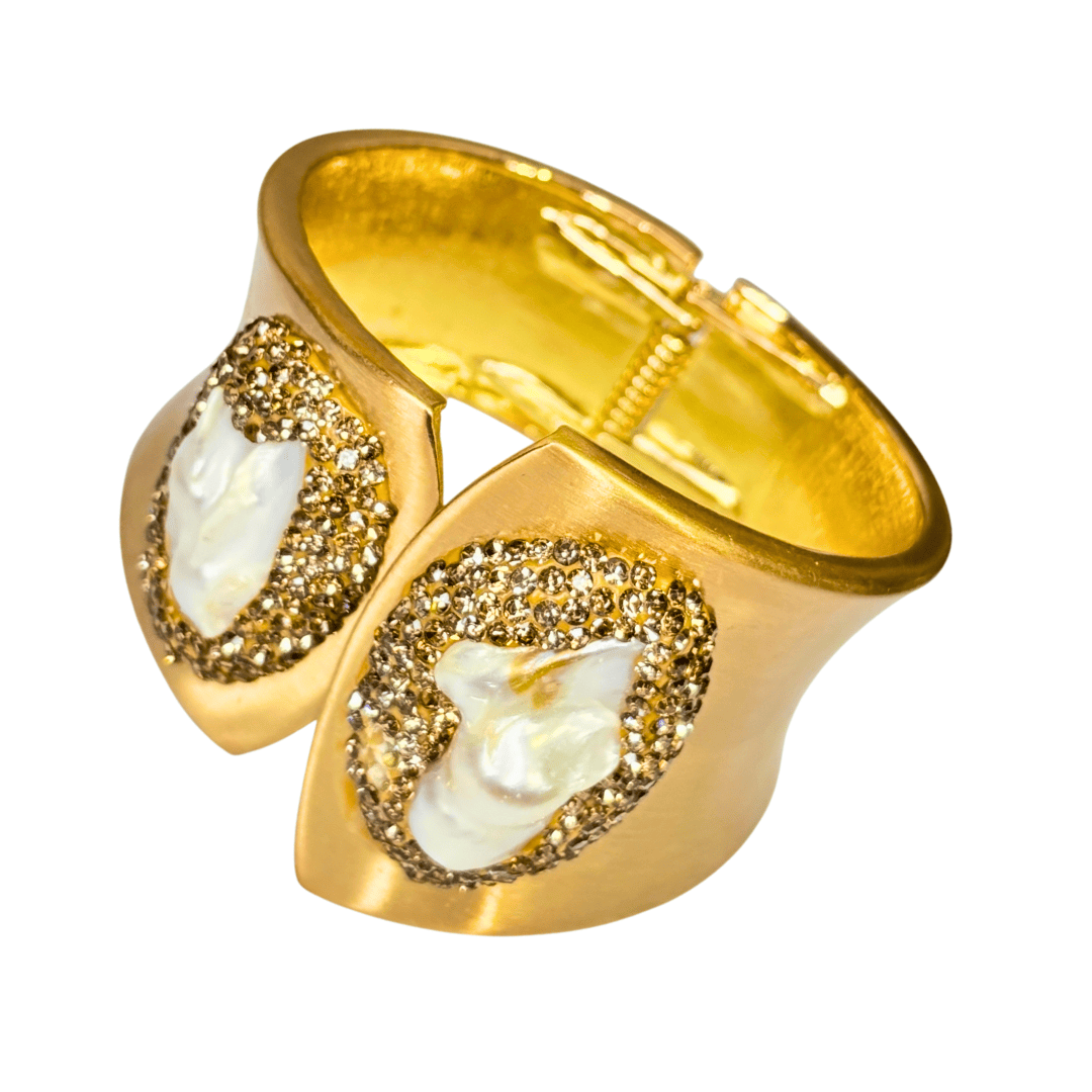Majestuosa pulsera de cobre con baño de oro 18k. y perla cultivada.