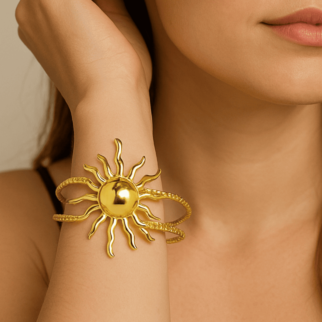 Delicada pulsera de filigrana dorada tejida, con diseño de sol. Para lucir elegante con cualquier atuendo.