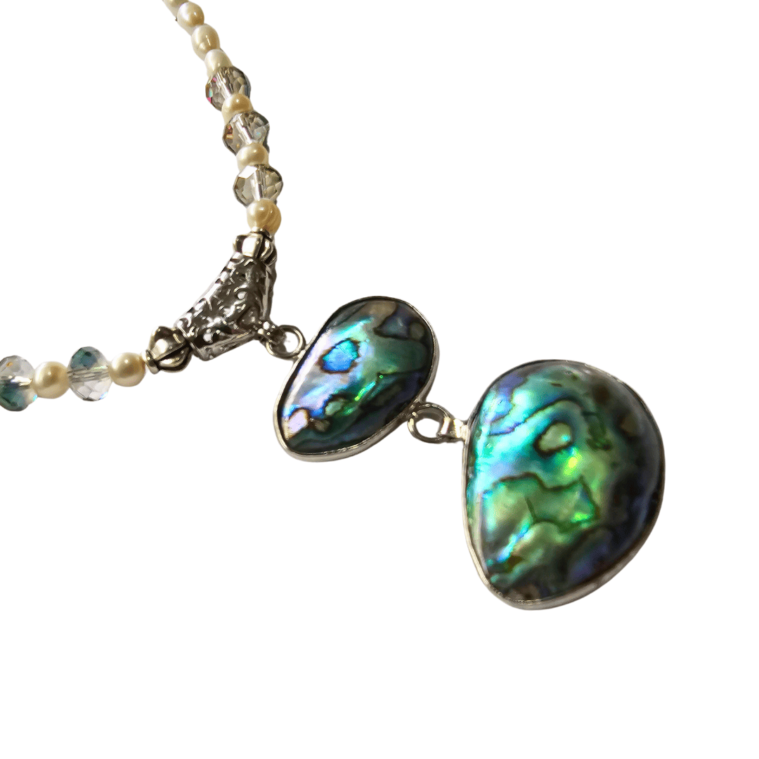 Refinado collar de bronce y baño plata, con concha natural abulón, perla cultivada y cristal checo.